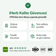 Bir ithalat beyannamesi düzenlenecek olup federal ve eyalet vergilerine tabi olacaktır. iHerb, ürün görselleri ve bilgilerinin doğruluğunu sağlamaya çalışır; ancak ambalaj ve/veya içeriklerde yapılan üretici kaynaklı değişiklikler sitemizde henüz güncellenmemiş olabilir. Ürünler zaman zaman farklı ambalajla gönderilse de, tazelik her zaman garanti edilir. Kullanımdan önce tüm ürünlerin etiketlerini, uyarılarını ve kullanım talimatlarını okumanızı; yalnızca iHerb’de yer alan bilgilere güvenmemenizi öneririz. Bu web sitesi, müşterilere kolaylık sağlamak amacıyla makine çevirisi kullanılarak sunulmuştur. iHerb, çevirilerin eksiksiz veya hatasız olduğunu garanti etmez ve çeviri hataları ya da eksikliklerinden sorumlu değildir.